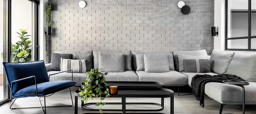 קיר הבריקים המקורי שהיה בסלון נשאר והועצם באמצעות תאורה בעיצוב שמדגיש את הצורניות והסגנון הייחודי שלו. הספה תוכננה ויוצרה במיוחד במידות מקסימליות, במטרה לאפשר ישיבה נוחה לכל חמשת בני המשפחה, ורופדה בבד בגוון אפור שנבחר כקו מנחה לבית כולו.