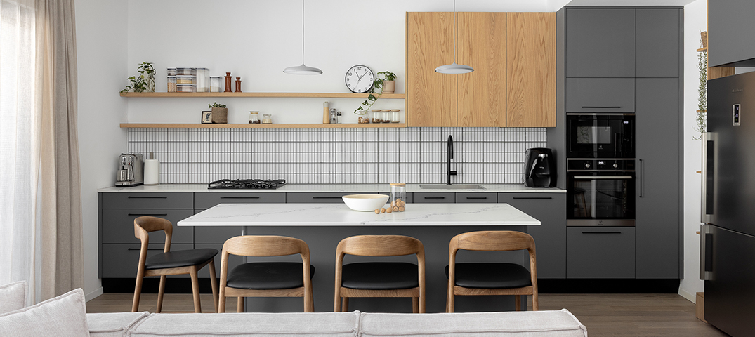 ארונות בגוון אפור גרפיט לצד עץ אלון טבעי