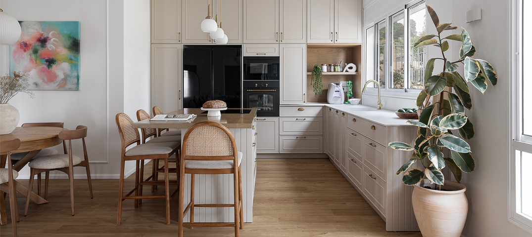 במרכז המטבח ניצב אי עם משטח עץ, המשמש הן להכנות ובישול והן לישיבה יומיומית על כיסאות בר המשלבים עץ וראטן המכניסים חמימות לעיצוב.